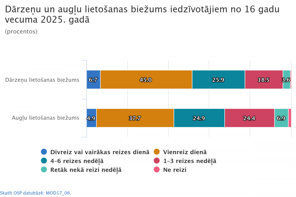 2025. gadā vairums jeb 77,6% (2022. gadā – 70,5%) Latvijas iedzīvotāju vecumā no 16 gadiem savā uzturā iekļāva dārzeņus ne retāk kā 4–6 reizes nedēļā, savukārt 3,9% iedzīvotāju tos savā uzturā lietoja retāk nekā reizi nedēļā vai nelietoja nemaz. 67,5% iedzīvotāju savā uzturā lietoja augļus ne retāk nekā 4–6 reizes nedēļā (2022. gadā – 58,3%). 8,1% tos savā uzturā iekļāva retāk nekā vienu reizi nedēļā vai neiekļāva nemaz.