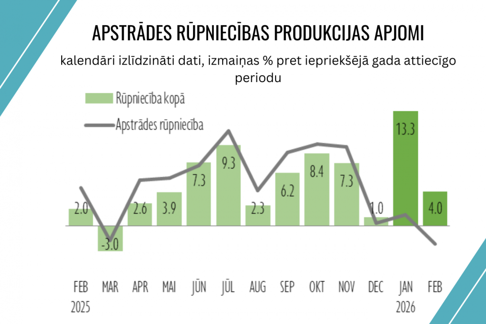 Apstrādes rūpniecības apjomus būtiski ietekmēja lielākās apstrādes rūpniecības apakšnozares – kokapstrādes apjomu kritums. Mērenāk samazinājās dzērienu, gumijas un plastmasu un apģērbu ražošanas apjomi. Savukārt pozitīvu ieguldījumu apstrādes rūpniecībā februārī gada griezumā deva otra lielākā apstrādes rūpniecības apakšnozare – pārtikas produktu ražošana. Tāpat pieauga arī metālapstrādes un datoru, elektronisko un optisko iekārtu ražošanas apjomi.