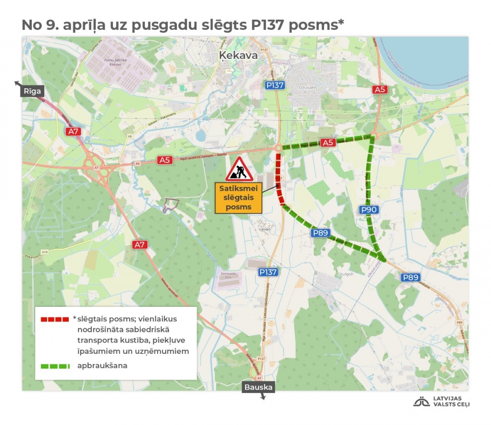 Slēgtā posma apbraukšana tiks organizēta pa reģionālajiem autoceļiem Rīgas HES–Pulkarne (P90) un P89, kā arī pa Rīgas apvedceļu (A5). Būvdarbu laikā autovadītājiem būs jārēķinās ar papildu laiku ceļā.