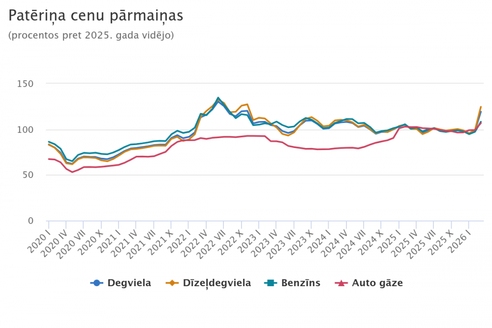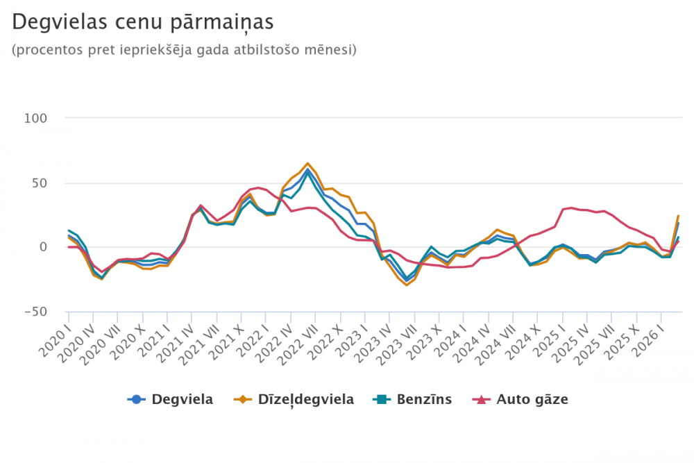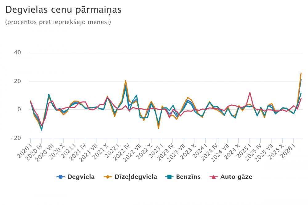 2026. gada martā, salīdzinot ar 2025. gada martu, vidējais patēriņa cenu līmenis degvielai pieauga par 18,5 %. Gada laikā dīzeļdegviela sadārdzinājās par 24,1 %. Benzīna cenas pieauga par 7,5 % un auto gāzes cenas par 4,3 %.