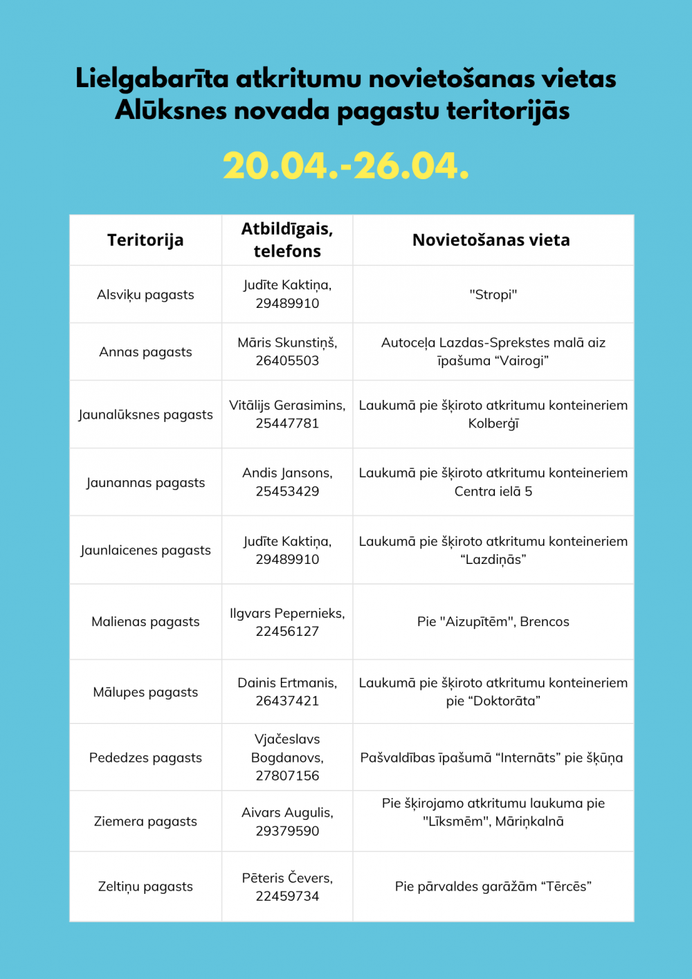 Lai pagastu iedzīvotājiem atvieglotu lielgabarīta atkritumu nodošanas procesu, vairākos pagastos būs noteiktas vietas, kurās no 20. līdz 26. aprīlim būs iespēja atvest un novietot lielgabarīta atkritumus. Uz šiem punktiem lielgabarīta atkritumus var vest jebkura pagasta iedzīvotāji.