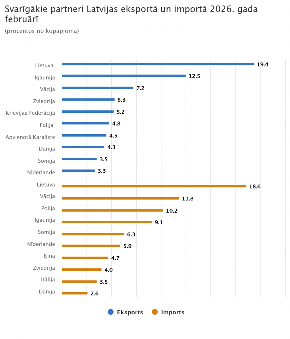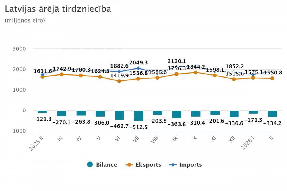 Šā gada divos mēnešos Latvijas ārējās tirdzniecības apgrozījums faktiskajās cenās sasniedza 6,76 miljardus eiro – par 219,1 milj. eiro jeb 3,1% mazāk nekā 2025. gada atbilstošajā periodā. Eksporta vērtība veidoja 3,13 miljardus eiro (samazinājums par 192,2 milj. eiro jeb 5,8%), bet importa – 3,63 miljardus eiro (samazinājums par 26,9 milj. eiro jeb 0,7%).