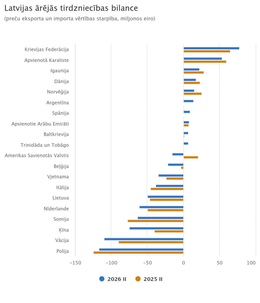 2026. gada februārī Latvijas ārējās tirdzniecības bilance bija pozitīva ar 122 partnervalstīm, preču eksporta vērtībai pārsniedzot importa vērtību. Negatīva tā bija tirdzniecībā ar 47 valstīm.