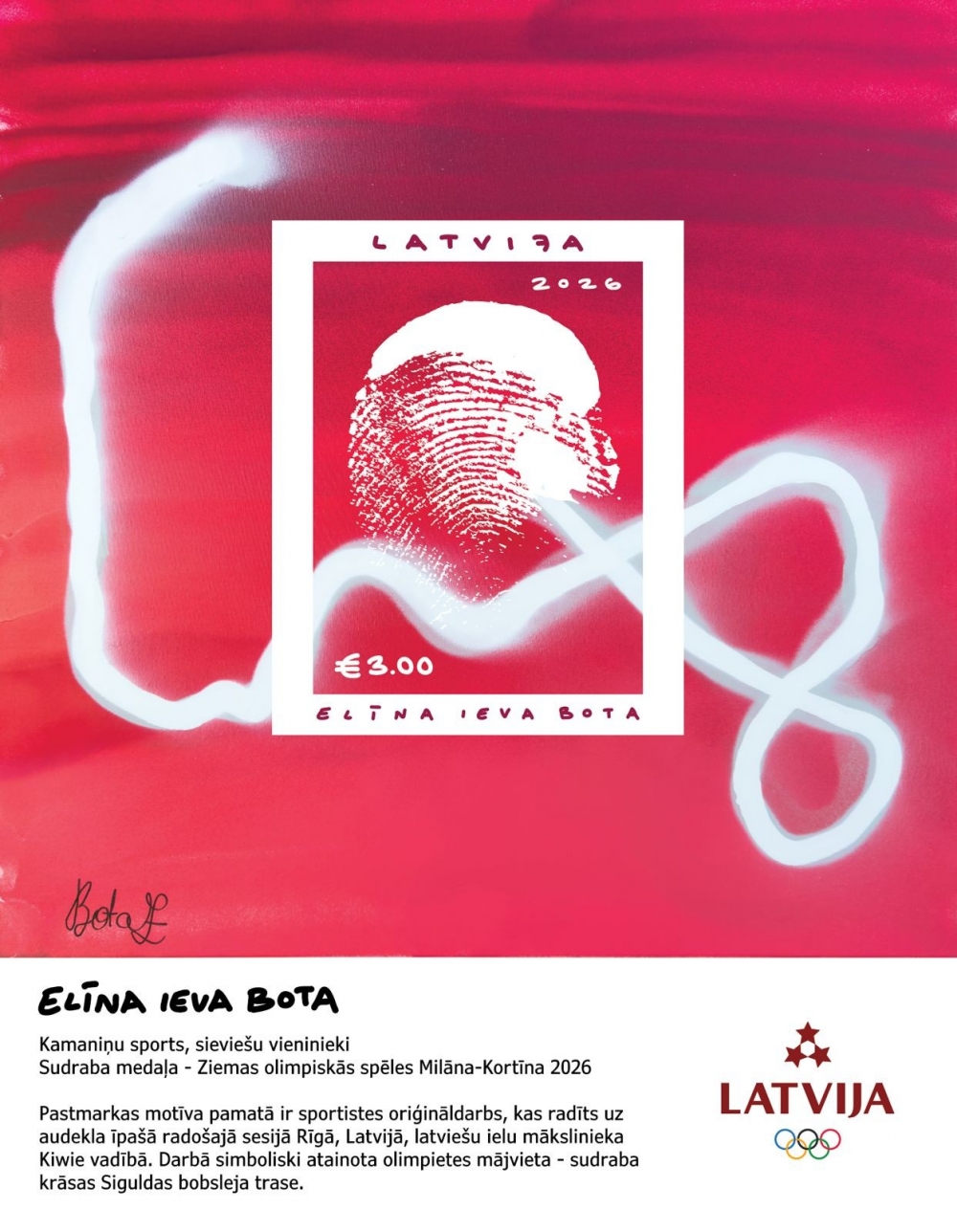“Dizainā abstrakti attēloju Latvijas karoga krāsas un trasi, kas simbolizē vietu, no kurienes nāku, kā arī sporta veidu, ar ko nodarbojos. Trase nav uzzīmēta pilnīgi precīzi, tā ir mana interpretācija, bet mērķis ir iepazīstināt cilvēkus, kuri zina tikai par izcīnītu medaļu, nevis konkrētu sporta veidu,” vēlmi atainot “mājas” treniņu vietu – Siguldas bobsleja trasi sudraba krāsās skaidro sieviešu kamaniņu braucēja, olimpiskās sudraba medaļas ieguvēja Elīna Ieva Bota.