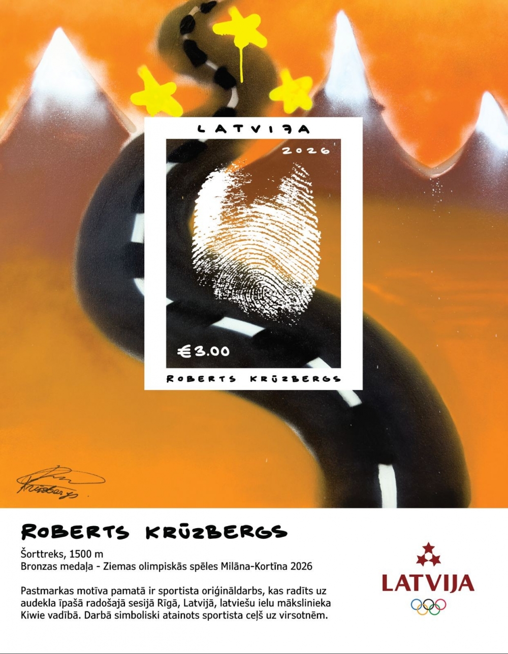 Filatēlijas sērijā “XXV ziemas olimpiskās spēles” iemūžināti Latvijas olimpiskie medaļnieki – Elīna Ieva Bota, kura izcīnīja sudraba medaļu sieviešu kamaniņu sporta vieniniekos, un Roberts Krūzbergs, kurš Latvijai guva pirmo olimpisko medaļu – bronzu – vīriešu šorttreka 1500 metru distancē. To papildina solidaritātes pastmarku bloks Ukrainas skeletonistam Vladislavam Heraskevičam, kuru diskvalificēja pirms oficiāla starta par izmantoto ķiveri, uz kuras attēloti vairāk nekā 20 Krievijas izvērstā kara upuri – sportisti un treneri.