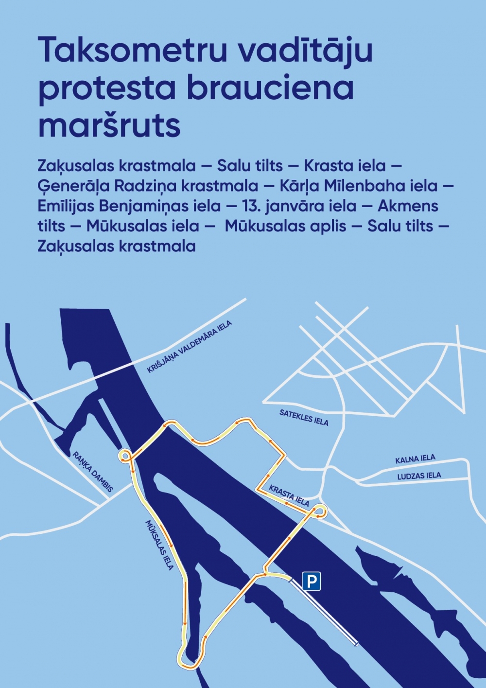 Pirmdien, 13.aprīlī no plkst. 8.00 līdz 14.00 notiks pasākuma dalībnieku pulcēšanās un sapulce Zaķusalas krastmalā, kā arī no plkst.9.00 līdz 11.00 brauciena maršrutā un blakus esošajās ielās tiks regulēta un nepieciešamības gadījumā slēgta transportlīdzekļu satiksme.