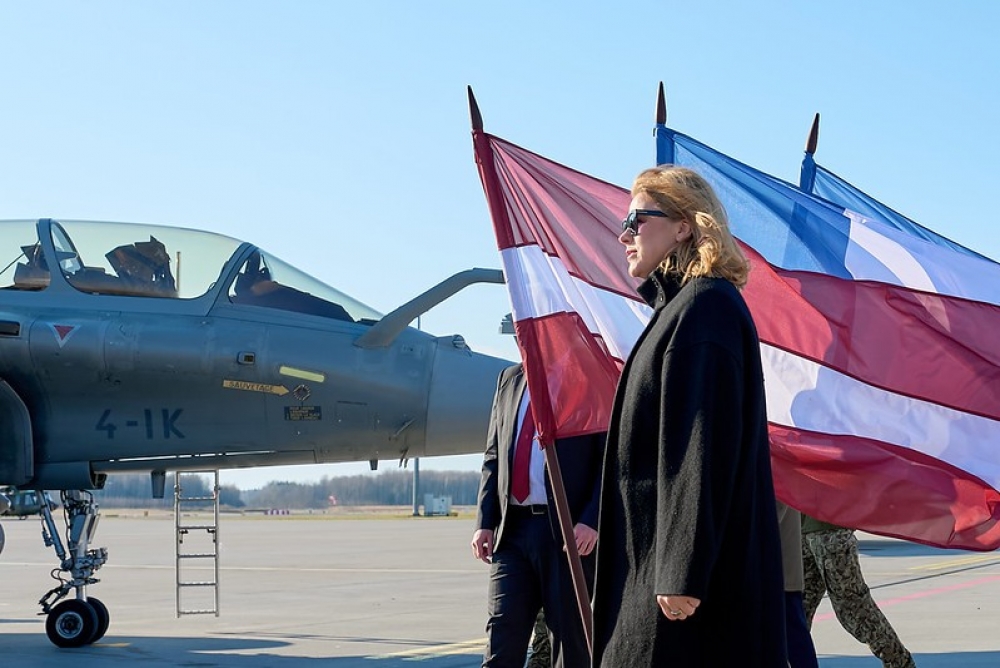 Ministru prezidente uzrunā uzsvēra, ka 22 gadu laikā, kopš Latvija ir NATO dalībvalsts, Francija ir parādījusi sevi kā uzticamu partneri, daudzkārt uzņemoties Baltijas gaisa telpas patrulēšanas misijas.