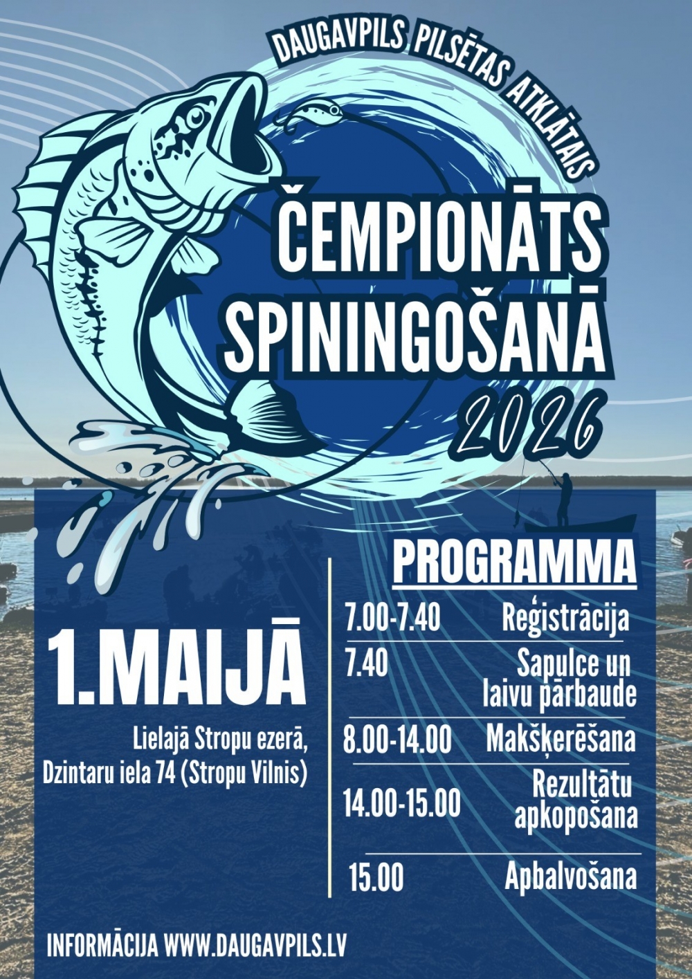 Sacensību pulcēšanās vieta atradīsies Lielajā Stropu ezera peldvietas “Stropu Vilnis” teritorijā, Dzintaru ielā 74. Dalībnieku reģistrācija sāksies no plkst. 7.00 līdz 7.40. Pēc tās sekos informatīvā sapulce un laivu pārbaude. Makšķerēšana notiks no plkst. 8.00 līdz 14.00, savukārt rezultātu apkopošana un apbalvošana plānota līdz plkst. 15.00.