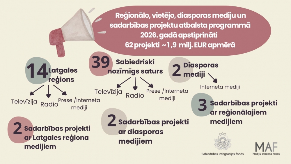 MAF programmā “Reģionālo, vietējo, diasporas mediju un sadarbības projektu atbalsta programma” neatkarīga komisija izvērtēja 72 pieteikumus. Attiecīgi SIF Padome apstiprināja rezultātus sešos konkursos: “Sabiedriski nozīmīgs saturs”, kurā saņemts lielākais pieteikumu skaits, apstiprināti – 8 projekti reģionālo TV atbalstam par kopējo finansējumu 223 585,05 EUR, 6 projekti reģionālo radio atbalstam par kopējo finansējumu – 195 527,40 EUR, 25 projekti drukātās reģionālās preses un interneta vietņu atbalstam par 824 922,06 EUR. Konkursā “Latgales reģions” apstiprināti 6 radio un TV projekti par kopējo finansējumu 117 474,54 un 8 projekti satura veidošanai drukātajā presē un interneta vietnēs Latgalē par 79 182,91 EUR, konkursā “Diasporas mediji” – 2 projekti par kopējo finansējumu 39 999,20 EUR, konkursā “Sadarbības projekti ar reģionālajiem medijiem” – 3 projekti par kopējo finansējumu 299 187,41 EUR, konkursā “Sadarbības projekti ar diasporas medijiem” – 2 projekti par kopējo finansējumu 56 344,00 EUR, konkursā “Sadarbības projekti ar Latgales reģiona medijiem” – 2 projekti par kopējo finansējumu 49 393,20 EUR.