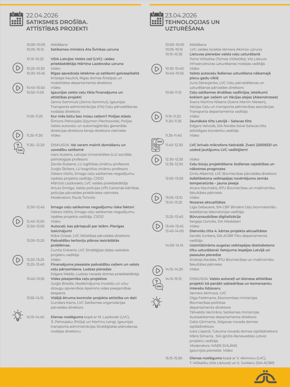 Konferences pirmā diena, 22. aprīlis, tradicionāli būs veltīta satiksmes drošībai un ceļu tīkla attīstībai. Plkst. 10.00 to atklās satiksmes ministrs Atis Švinka un VSIA Latvijas Valsts ceļi (LVC) valdes priekšsēdētājs Mārtiņš Lazdovskis.