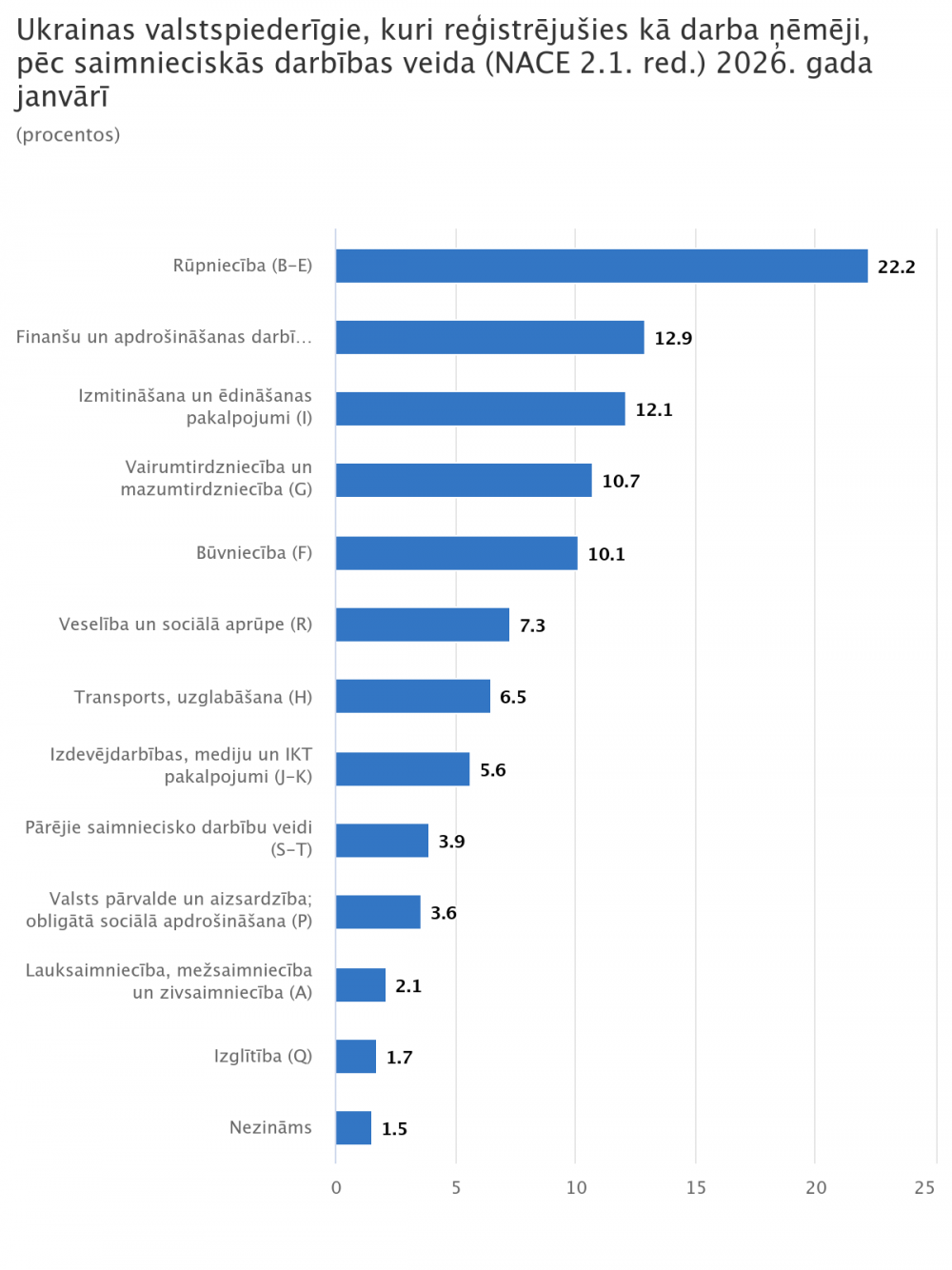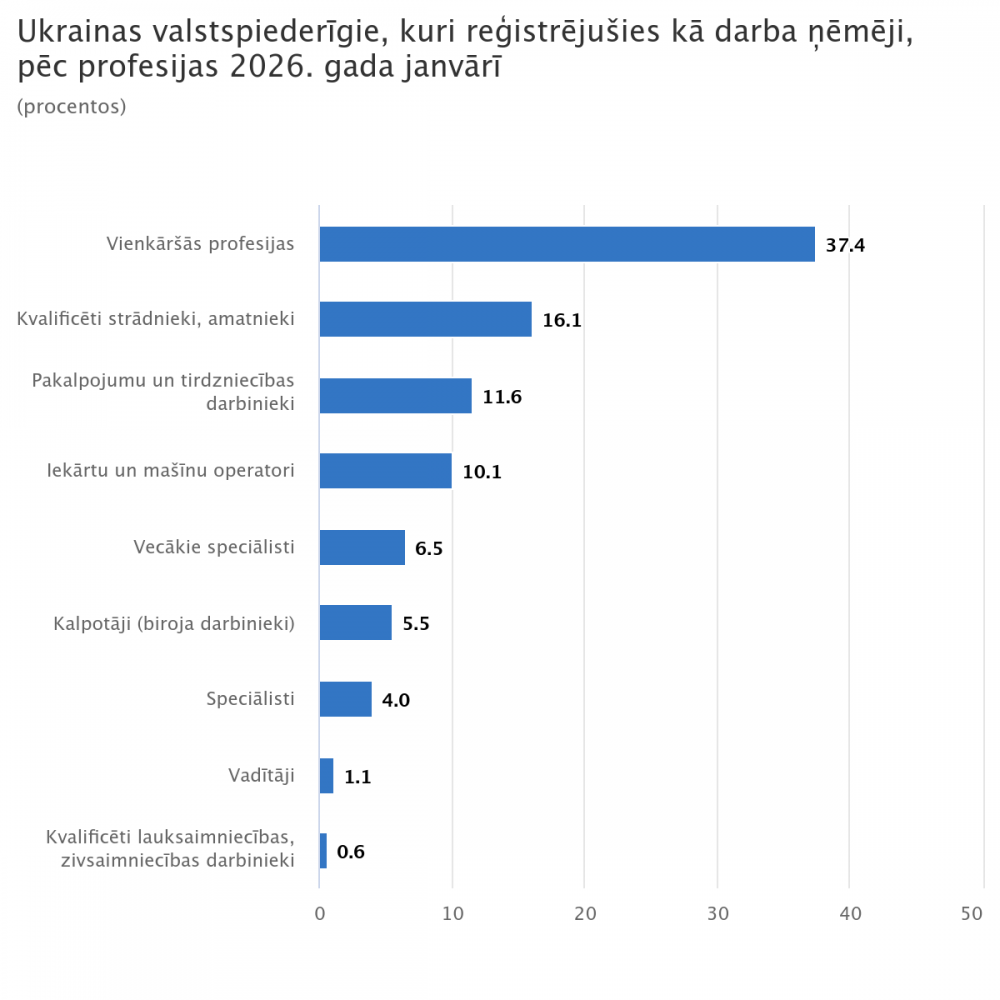 Pēc Valsts ieņēmumu dienesta datiem 2026. gada sākumā 10,5 tūkstoši Ukrainas valstspiederīgo bija reģistrēti kā darba ņēmēji. Visbiežāk ukraiņi strādā rūpniecībā – 22,2%, finanšu, apdrošināšanas, zinātnisko, administratīvo pakalpojumu un operāciju ar nekustamo īpašumu jomās – 12,9%, izmitināšanā un ēdināšanā – 12,1%, vairumtirdzniecības un mazumtirdzniecības nozarēs ir nodarbināti 10,7%, kā arī 10,1% strādā būvniecībā.