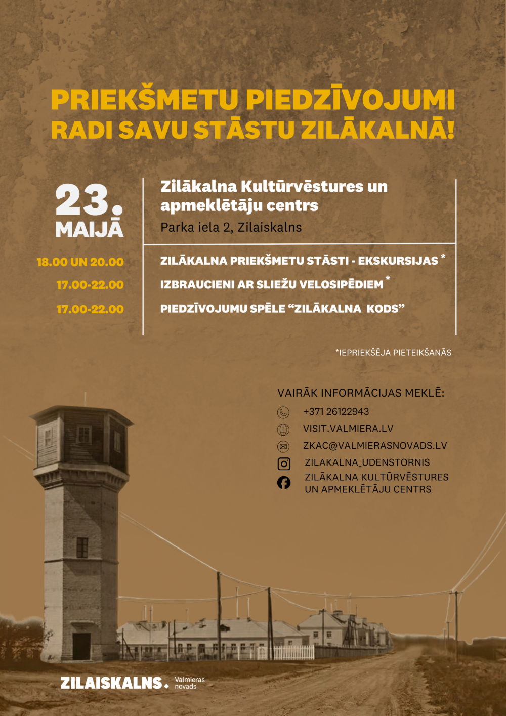 Vietas kļūst par piedzīvojumiem tikai tad, kad mēs tās atklājam. Muzeju nakts laikā izzinošā piedzīvojumā aicinās Zilākalna iedzīvotāja un stāstniece Elīna Sokolova-Luca, lai caur dažādiem priekšmetiem atklātu dažus no ciemata stāstiem un noslēpumiem. Ekskursijas laikā varēs izzināt, kā mainījusies Zilākalna vide un kādi zīmīgi cilvēki spēlējuši svarīgu lomu šīs vietas attīstībā. Īpaša uzmanība tiks veltīta arī (Zilam) kalnam – vietai, kas apvīta ar leģendām un joprojām glabā savus noslēpumus, gaidot arvien jaunus atklājējus. Ekskursijas notiks plkst. 18.00 un 20.00. Sākums pie Zilākalna ūdenstorņa (Parka iela 2, Zilaiskalns). Dalība ir bez maksas. Nepieciešama iepriekšēja pieteikšanās, zvanot pa tālruni 26122943 vai rakstot uz e-pasta adresi: zkac@valmierasnovads.lv