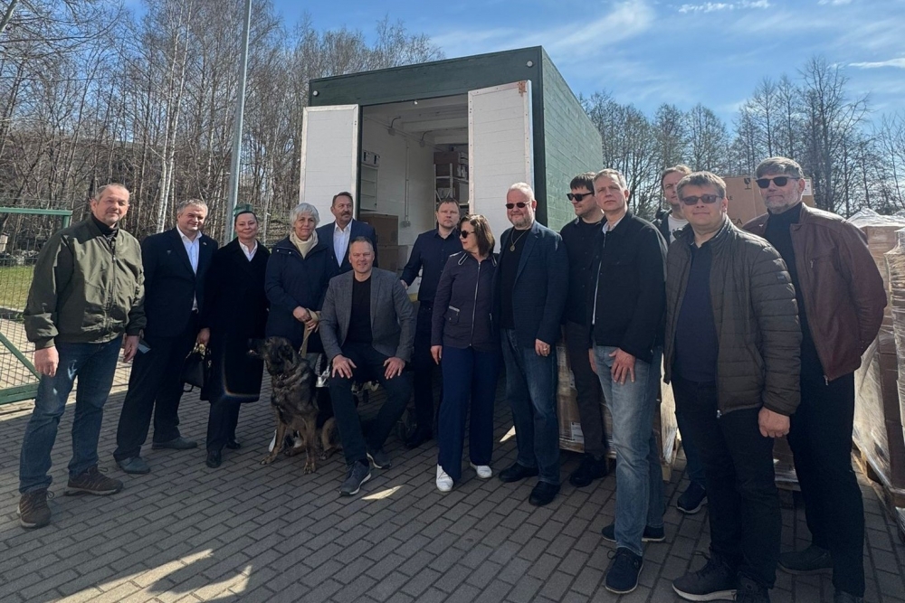 Latvijā radītā pārvietojamā operāciju zāle Ukrainai un projekta komanda 2026. gada 17. aprīlī.