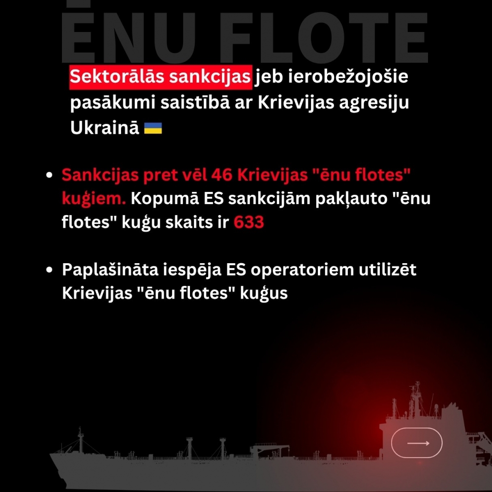 Sankcijas pret vēl 46 Krievijas "ēnu flotes" kuģiem. Kopumā ES sankcijām pakļauto "ēnu flotes" kuģu skaits ir 633.