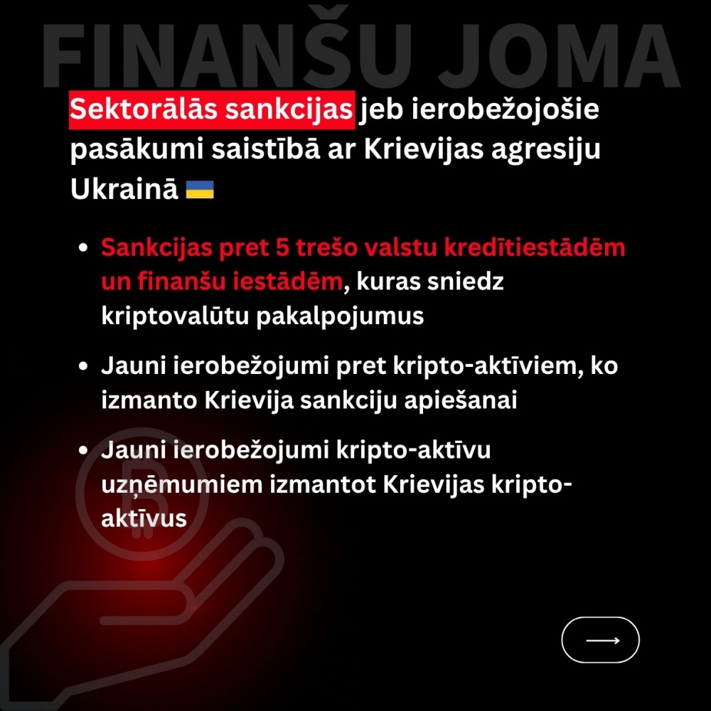 Sankcijas pret trešo valstu bankām par iesaisti Krievijai noteikto sankciju apiešanā.