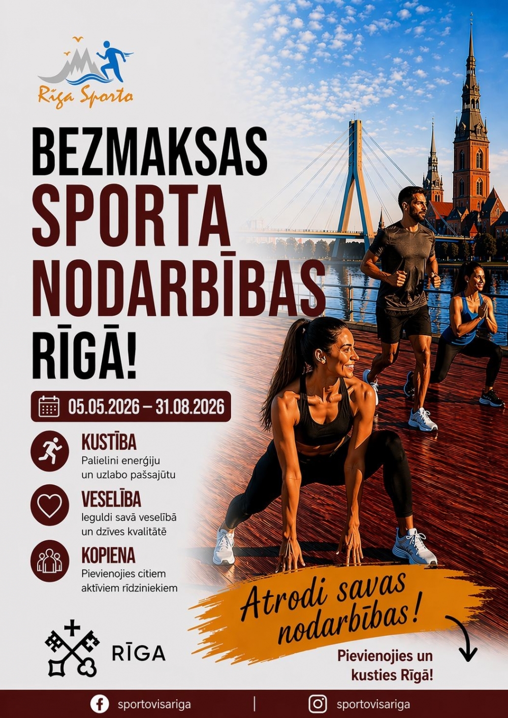 Ar mērķi veicināt aktīvu dzīvesveidu un rūpes par veselību Rīgas pašvaldība arī šogad nodrošina bezmaksas sporta treniņus profesionālu treneru vadībā dažādās Rīgas pilsētas apkaimēs.