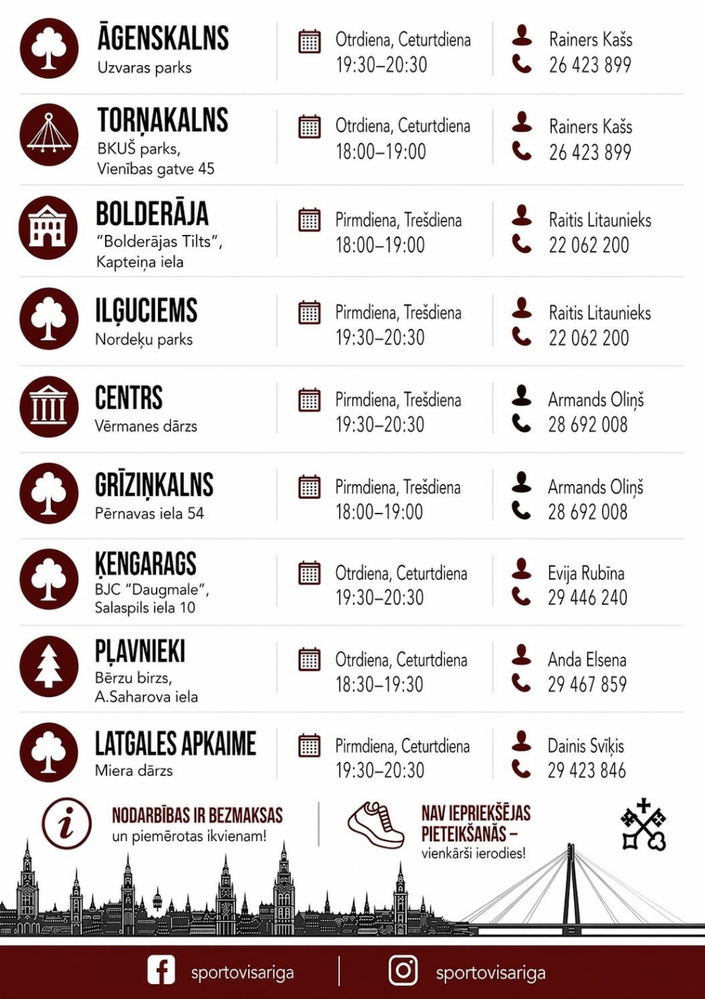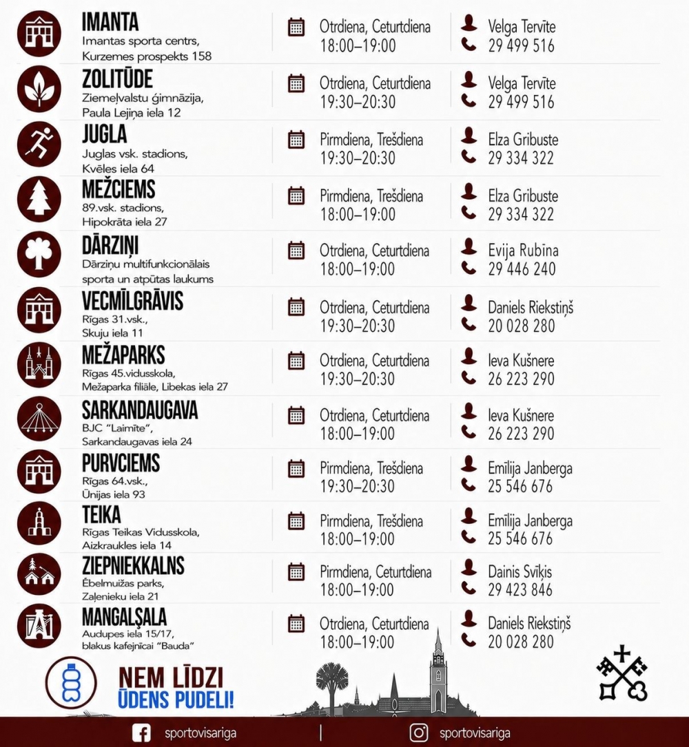 Bezmaksas treniņi notiek 20 apkaimēs – Torņkalnā, Āgenskalnā, Iļģuciemā, Daugavgrīvā, Grīziņkalnā, centrā, Imantā, Zolitūdē, Mežciemā, Juglā, Ķengaragā, Pļavniekos, Ziepniekkalnā, Latgales apkaimē, Mangaļsalā, Vecmīlgrāvī, Sarkandaugavā, Mežaparkā, Teikā, Purvciemā.
