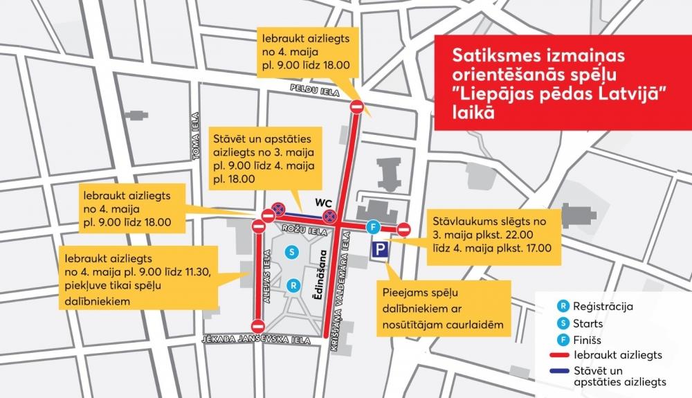Saistībā ar plānotajām aktivitātēm pilsētas centrā tiks ieviestas izmaiņas satiksmes organizācijā. Autovadītājiem jārēķinās, ka Rožu ielas posmā no Krišjāņa Valdemāra ielas līdz Alejas ielai apstāšanās un stāvēšanas aizliegums būs spēkā no 3. maija plkst. 9.00 līdz 4. maija plkst. 18.00. Savukārt pašvaldības stāvlaukums pie domes ēkas Rožu ielā 6 būs slēgts no 3. maija plkst. 22.00 līdz 4. maija plkst. 17.00, paredzot vietas tikai orientēšanās spēļu dalībniekiem ar speciālām caurlaidēm.