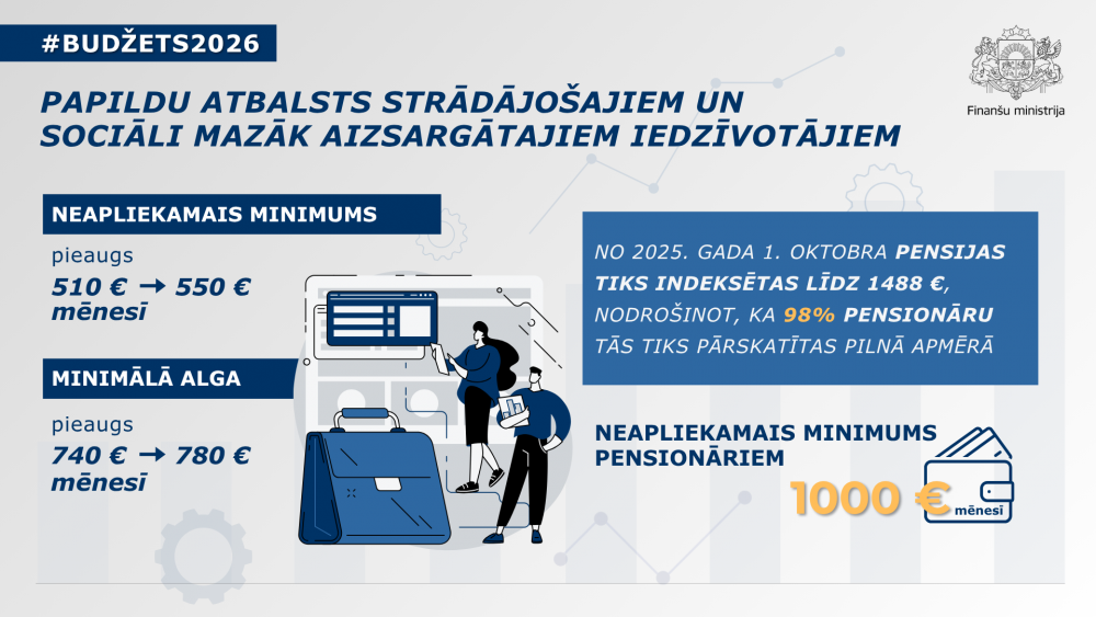 Plānots, ka 2026. gadā par 40 eiro pieaugs minimālā alga, sasniedzot 780 eiro (šobrīd – 740 eiro).