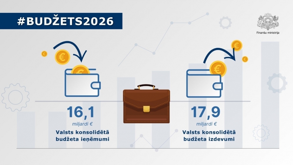 Ministru kabinets otrdien, 14. oktobrī, apstiprināja likumprojektu “Par valsts budžetu 2026. gadam un budžeta ietvaru 2026., 2027. un 2028. gadam”. 2026. gada valsts konsolidētā budžeta ieņēmumi tiek plānoti 16,1 miljarda, savukārt izdevumi – 17,9 miljardu eiro apmērā. Par budžeta prioritārajiem attīstības virzieniem noteikta drošība, demogrāfija un kvalitatīva izglītība – šīm jomām nākamgad paredzēts lielāks finansējums. Finanšu ministrijas sniegtā informācija liecina, ka 2026. gadā plānots arī vēsturiski augstākais Eiropas Savienības (ES) fondu investīciju apjoms – vairāk nekā viens miljards eiro –, kā arī pašvaldību ieņēmumu pieaugums par 151,4 miljoniem eiro.