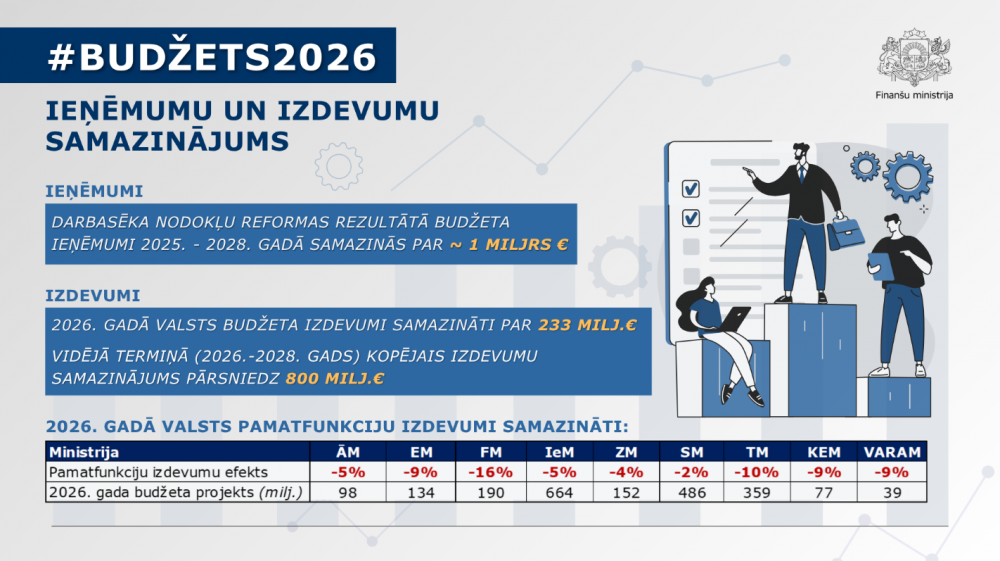 2026. gadā valsts budžeta izdevumi samazināti par 233 miljoniem eiro.