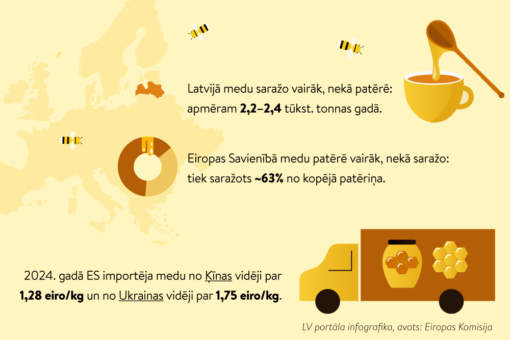 Vienlaikus Biškopības biedrības priekšsēdētājs uzsver, ka tā nav tikai Latvijas problēma, tā ir visas ES problēma: “Eiropas Komisijas 2023. gada veiktais pētījums liecina, ka no 320 analizētajiem medus paraugiem 46% bija viltojumi.”