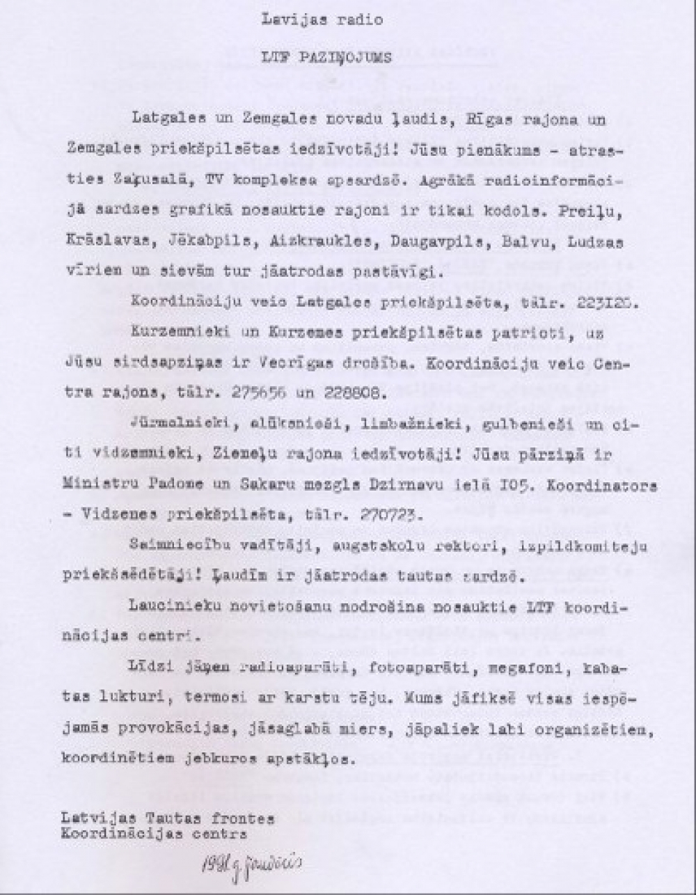 LTF paziņojums, kas noteica, pie kuriem stratēģiskajiem objektiem katra novada ļaudīm jāpaliek pēc manifestācijas beigām, 13. janvārī neskaitāmas reizes tika nolasīts Latvijas Radio tiešraidē.