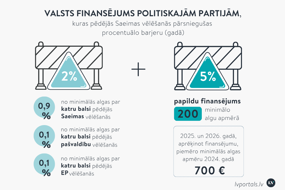 Patlaban Saeima lēmusi finansējuma pieaugumu iesaldēt 2024. gada līmenī. 2026. gadā valsts budžeta finansējumu politiskajai organizācijai (partijai) aprēķina, ņemot vērā minimālo mēnešalgu 2024. gadā (700 eiro).