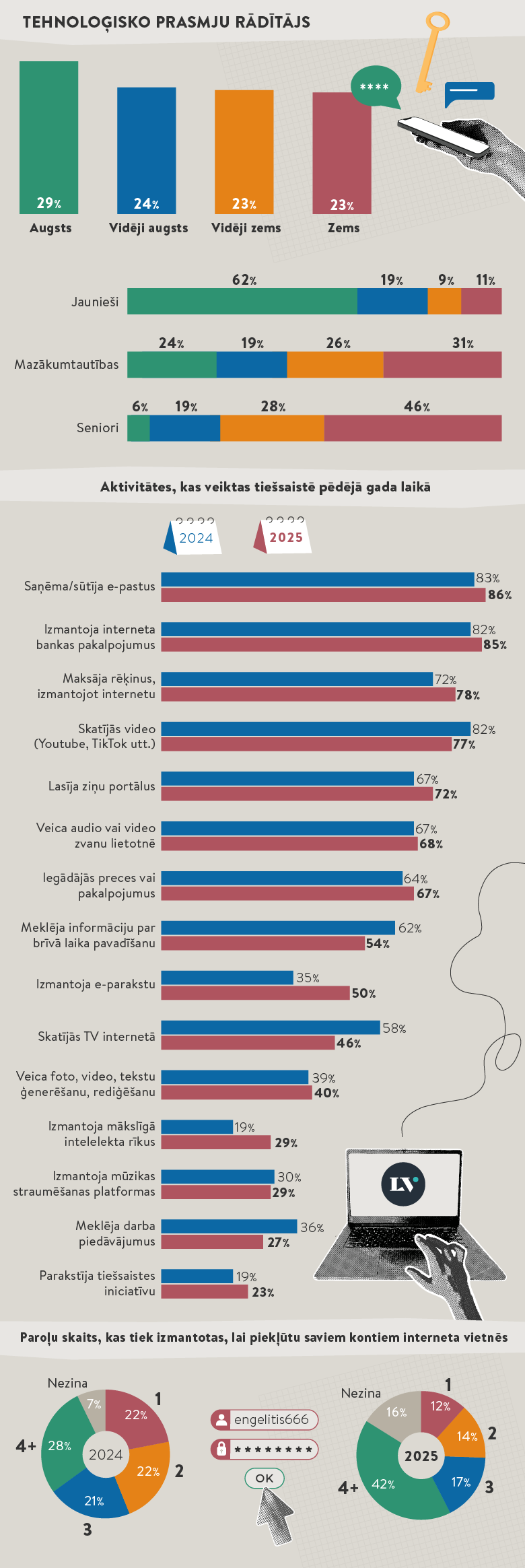 Informācijas tehnoloģijas rīku izmantošanas prasmes un spēja piekļūt informācijai sabiedrībā visai strauji progresē. Pieaudzis kopējais interneta lietotāju skaits, šogad sasniedzot 94% (+ 9% salīdzinājumā ar 2024. gadu), kas nozīmē, ka internetu lieto gandrīz visa Latvijas sabiedrība. Paplašinās arī tā izmantošanas mērķi un veidi, aizvien vairāk dažādu aktivitāšu tiek veiktas tiešsaistē. Šogad pieaudzis respondentu skaits, kuri tiešsaistē izmantojuši e-parakstu vai citus personas apliecināšanas rīkus un mākslīgo intelektu (MI). Informācijas tehnoloģijas rīku izmantošanas prasmes ievērojami paaugstinājušās senioru vidū. Tā, piemēram, šajā vecuma grupā par vairāk nekā 25% pieaudzis respondentu skaits, kuri prot uzņemt un pārsūtīt attēlus un video, uzrakstīt e-pastu, atrast informāciju, izmantojot interneta meklētāju, lejupielādēt lietotni viedtālrunī vai planšetdatorā.