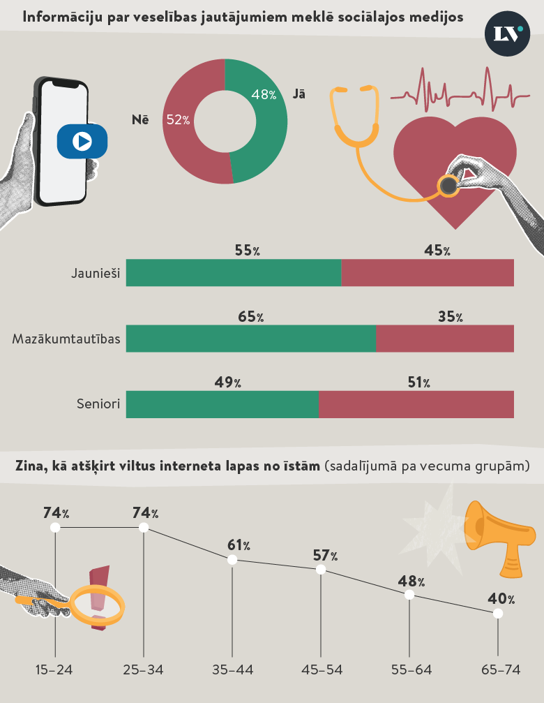 48% aptaujas dalībnieku, kuri izmanto interneta meklēšanas rīkus, situācijā, kad vajadzīga informācija par fiziskās vai mentālās veselības jautājumiem, atbildes meklē sociālo mediju saturā. Tā uzskatāma par bīstamu tendenci, jo šāda informācija netiek pārbaudīta, algoritmi izceļ nevis uzticamu, bet gan populāru un emocionāli piesaistošu saturu, kas var rezultēties ar neefektīvu vai kaitīgu pašdiagnosticēšanos un ārstēšanos.