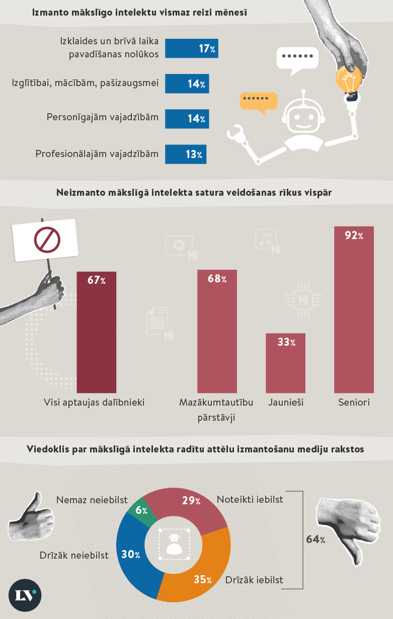 Katrs trešais (32%) Latvijas iedzīvotājs pēdējā gada laikā ir izmantojis kādu mākslīgā intelekta rīku. Katrs otrais (49%) aptaujas dalībnieks kopumā atbalsta MI izmantošanu, ja ar to tiek veicināti labi darbi sabiedrībai, piemēram, empātijas izrādīšana līdzcilvēkiem vai palīdzība dzīvniekiem. Aptaujas rezultātu analīze atklāj – jo augstāks respondenta finansiālās nodrošinātības un izglītības līmenis un jo urbanizētākā vidē viņš dzīvo, jo lielāki sociālās drošības riski tiek saskatīti dziļviltojumu (deepfake) izmantošanā.