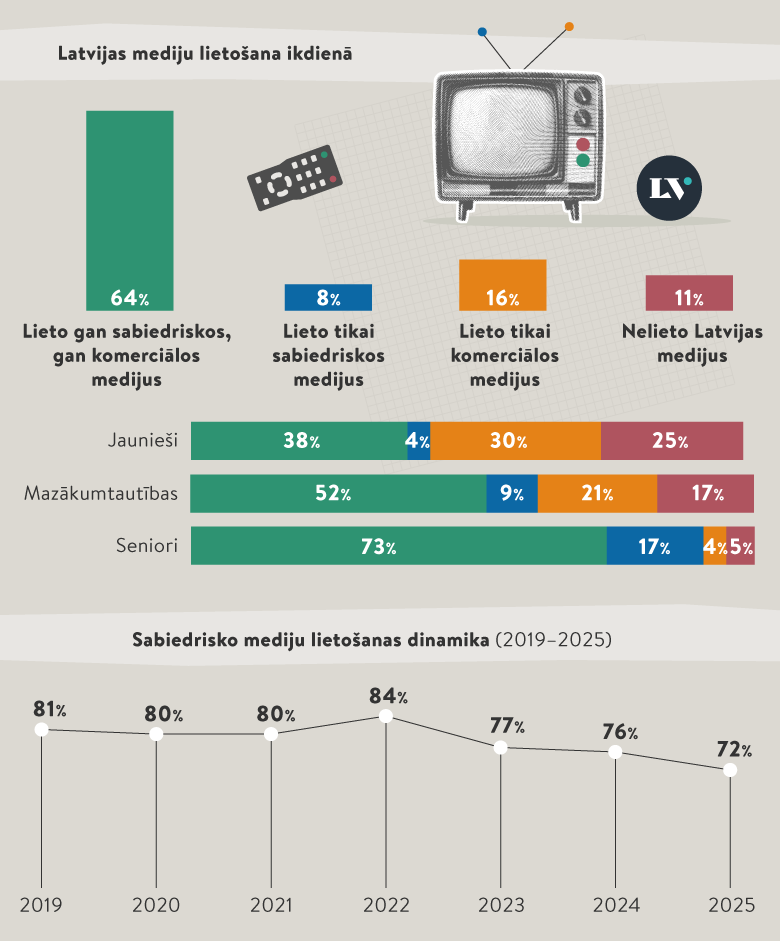 Sabiedrisko mediju lietotāju skaits pakāpeniski mazinās, šogad sasniedzot zemāko rādītāju pēdējo sešu gadu laikā. Lietotāju skaits krities arī Latvijas komerciālajiem medijiem. Samērā augsts sabiedrisko mediju lietošanas līmenis bija vērojams 2022. gadā, kad interesi paaugstināja Krievijas uzsāktais karš Ukrainā.