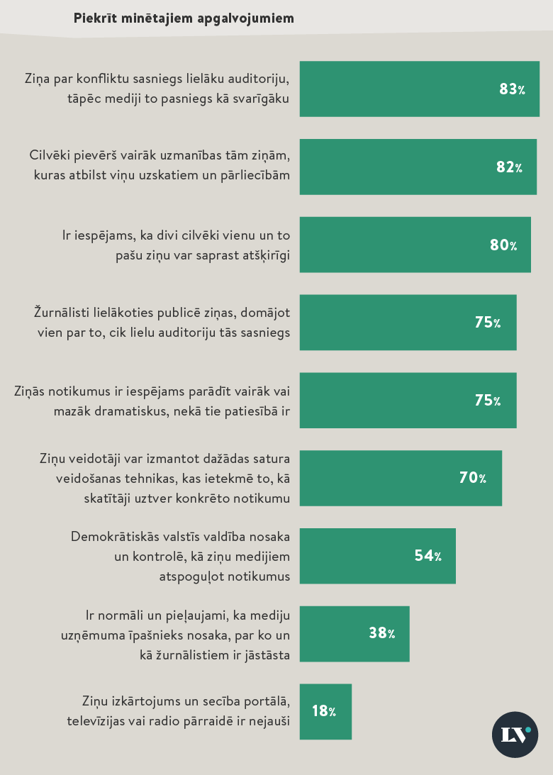 Vairāk nekā puse aptaujāto iedzīvotāju joprojām uzskata, ka demokrātiskās valstīs valdība var noteikt un kontrolēt to, kā ziņu medijiem jāatspoguļo notikumi. Salīdzinājums ar iepriekšējās aptaujas rezultātiem liecina, ka šādi domā arvien lielāka daļa sabiedrības. Kopumā respondenti uzskata, ka Latvijas mediji korekti attēlo faktus, ziņas tiek sniegtas līdzīgā veidā, taču var atšķirties stils, kā konkrētais informācijas avots vai žurnālists apraksta notikumu un kam pievērš uzmanību.