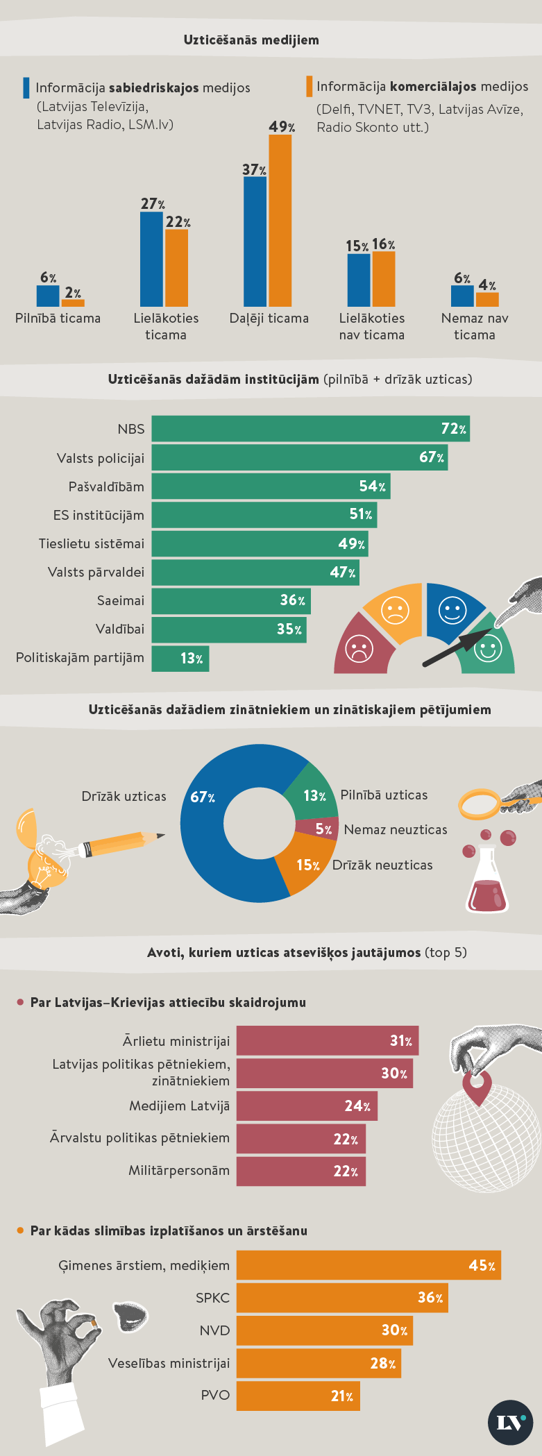 Tradicionāli zema ir sabiedrības paļaušanās uz valsts politisko vidi. Savukārt zinātniekiem un zinātniskajiem pētījumiem uzticas vairāk nekā trīs ceturtdaļas (80%) aptaujāto Latvijas iedzīvotāju, gandrīz identiski rezultāti vērojami arī pētījuma mērķa grupās. Biežāk minētie informācijas avoti, kuru skaidrojumam par Latvijas–Krievijas attiecībām iedzīvotāji uzticētos, kopš iepriekšējā pētījuma nav būtiski mainījušies.