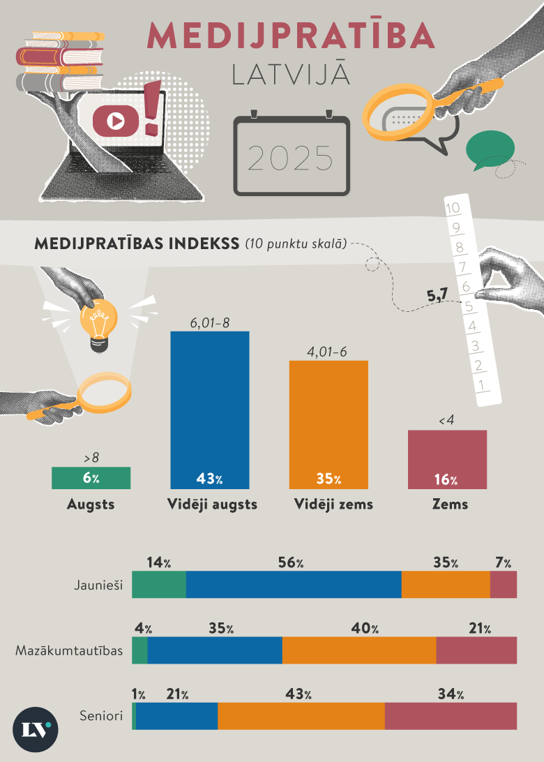 Zemāki rādītāji ir arī mazākumtautību pārstāvju vidū – vairākumam (61%) aptaujāto medijpratības līmenis ir mazāks par sešiem punktiem.