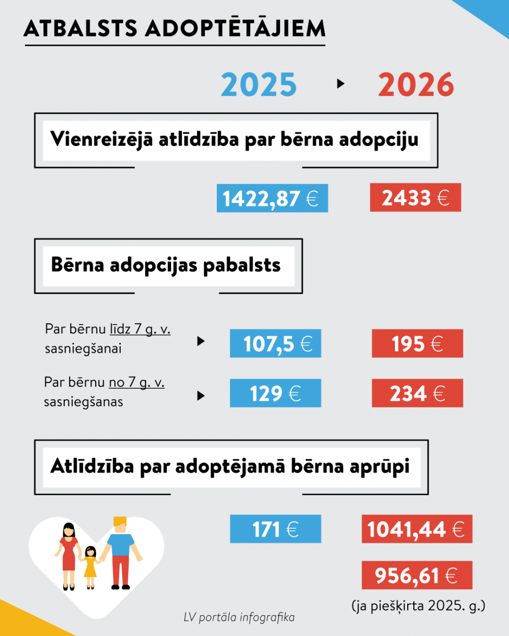 Lai veicinātu ģimeņu finansiālās iespējas uzņemties bērna adopciju, no 2026. gada 1. janvāra būtiski celta atlīdzība par adoptējamā bērna aprūpi, bērna adopcijas pabalsts un vienreizējā atlīdzība par bērna adopciju.