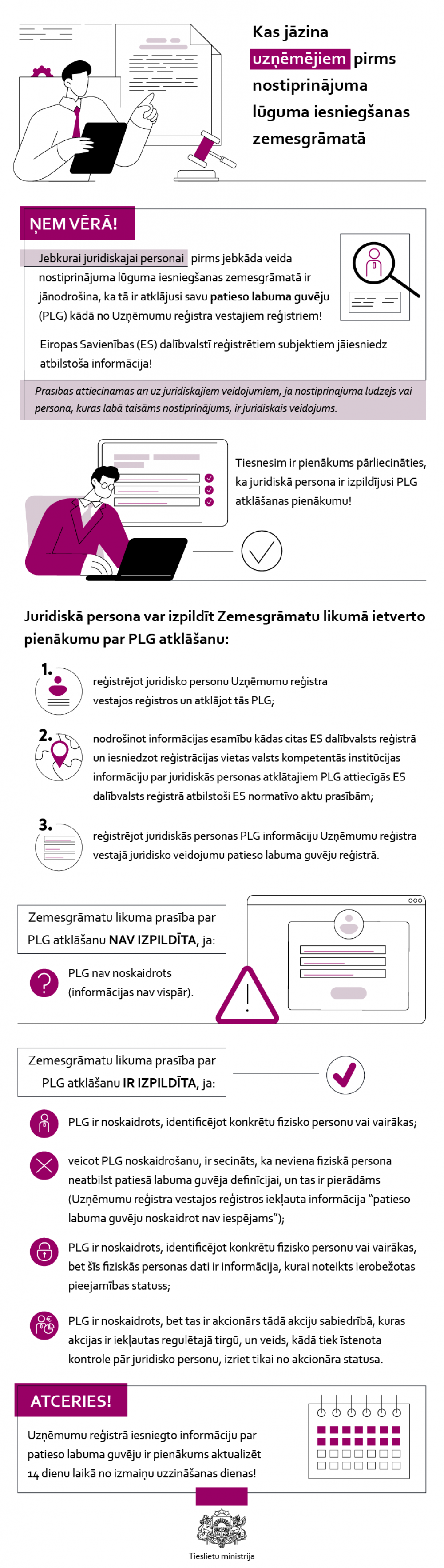 Tiesību akti noteic, ka jebkurai juridiskajai personai vai juridiskajam veidojumam pirms jebkāda veida nostiprinājuma lūguma iesniegšanas zemesgrāmatā jānodrošina, ka tas ir atklājis savu patieso labuma guvēju. Sadarbībā ar Tieslietu ministriju skaidrojam, kas kopsakarā ar patieso labuma guvēju atklāšanu jāņem vērā juridiskajām personām un juridiskajiem veidojumiem, lai nostiprinātu īpašumtiesības uz nekustamo īpašumu zemesgrāmatā.