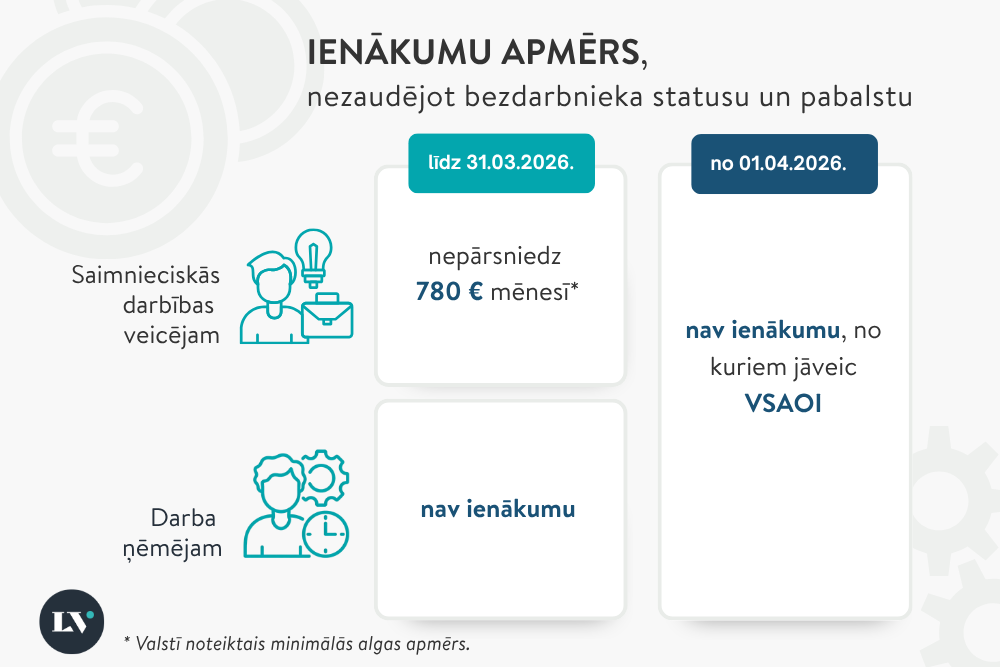 Lai nodrošinātu vienlīdzīgu pieeju un tiesības uz NVA piedāvātajiem nodarbinātības atbalsta pakalpojumiem, turpmāk uz visiem nodokļu maksāšanas režīmiem (arī saimnieciskās darbības veicējiem un autoratlīdzību saņēmējiem) tiks attiecināta vienāda prasība. Tā paredz, ka bezdarbnieka statuss tiek zaudēts, ja persona gūst ienākumus, no kuriem jāveic valsts sociālās apdrošināšanas obligātās iemaksas (VSAOI).