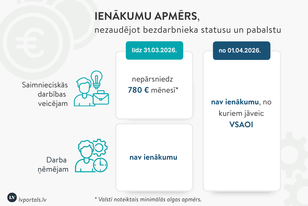 Tas nozīmē, ka turpmāk bezdarbnieka statusa laikā persona varēs neierobežotu reižu skaitu iegūt darba ņēmēja vai pašnodarbinātā statusu vai gūt ienākumus, kas ir VSAOI objekts, uz laiku, kas nepārsniedz 92 dienas darba ņēmējiem vai trīs mēnešus pašnodarbinātajiem.