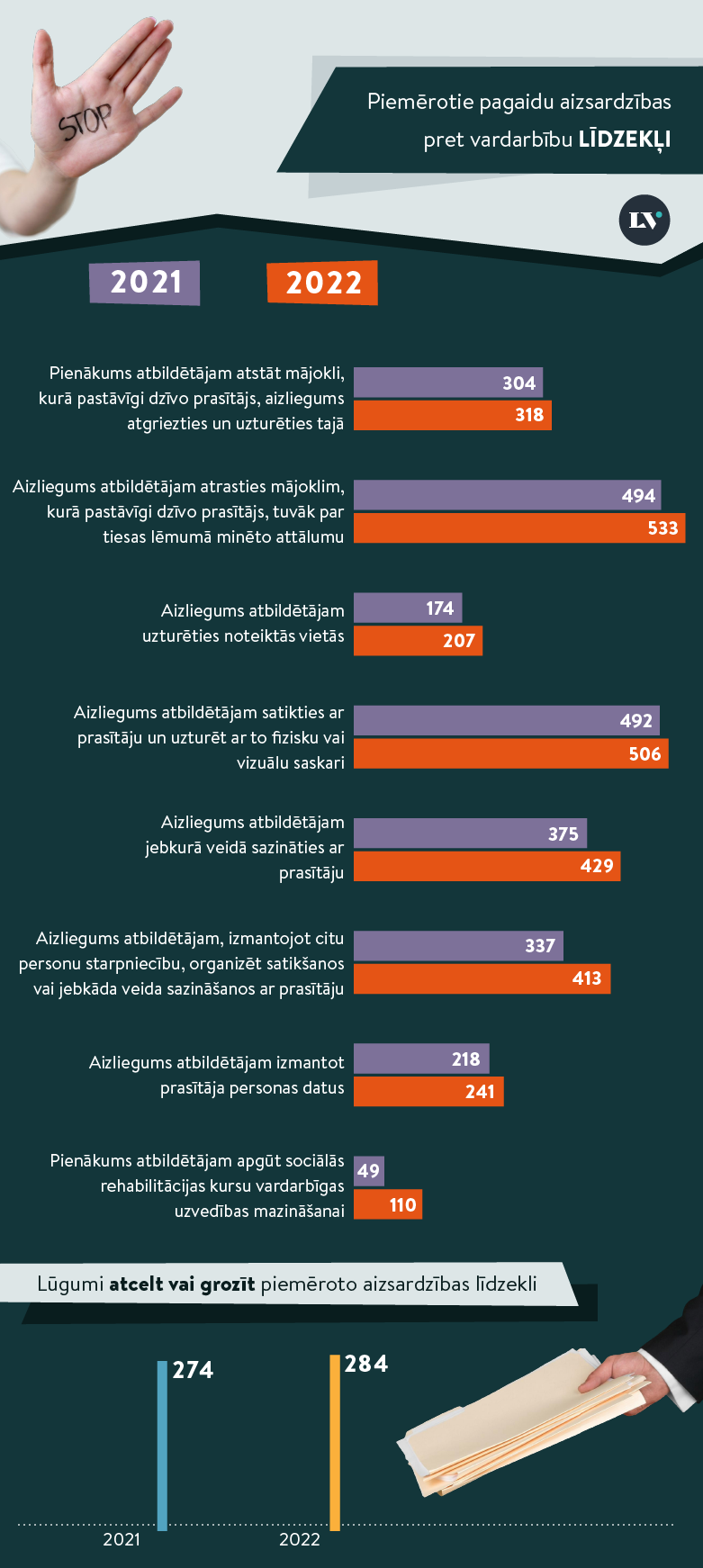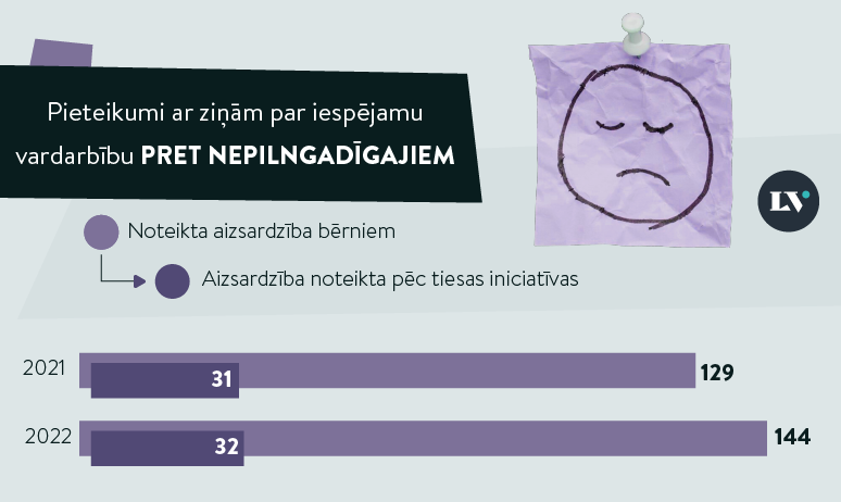 - Tiesa lietās par pagaidu aizsardzības piešķiršanu informējusi bāriņtiesu 657 gadījumos, kas liecina par bērnu esamību ģimenēs, kurās, iespējams, viņi cieš no sev vistuvāko pieaugušo cilvēku vardarbības vai ir tās liecinieki.