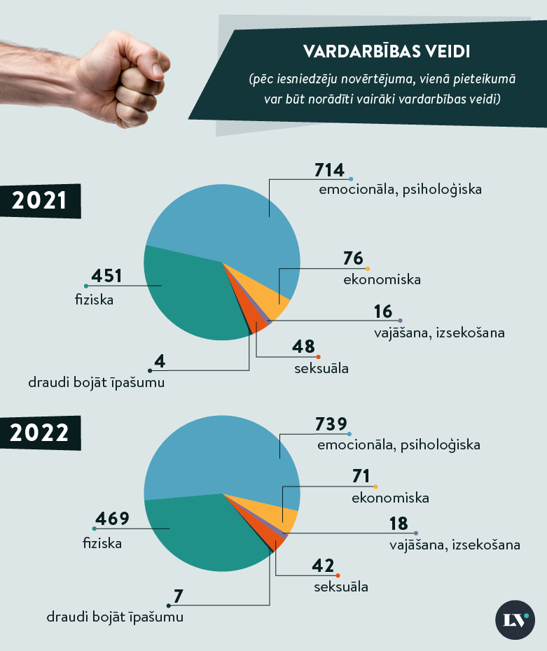 - Visizplatītākais vardarbības veids bijusi emocionālā vardarbība, kura tikusi norādīta līdzās pārējiem vardarbības veidiem, kā arī viena pati, savukārt fiziskā vardarbība norādīta vairāk nekā pusē visu pieteikumu.