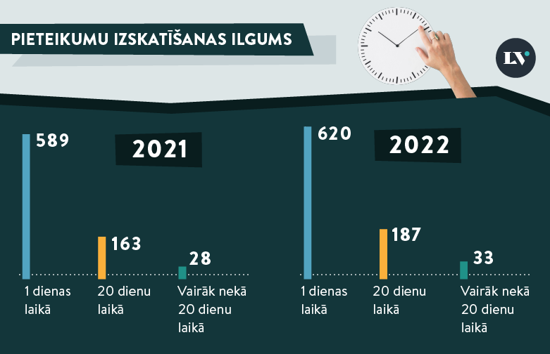 - Vairākumā gadījumu tiesa izskatījusi pieteikumus, ievērojot likumā noteikto termiņu2, proti, vienas dienas laikā (vairāk nekā 67% gadījumu) vai, pieprasot informāciju, – 20 dienu laikā;