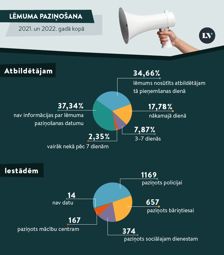 - Vairāk nekā 34% lēmumu tika nosūtīti atbildētājam to pieņemšanas dienā, vairāk nekā 17% – nākamajā dienā, gandrīz 8% – trijās līdz septiņās dienās, bet 2,35% – vairāk nekā pēc septiņām dienām.