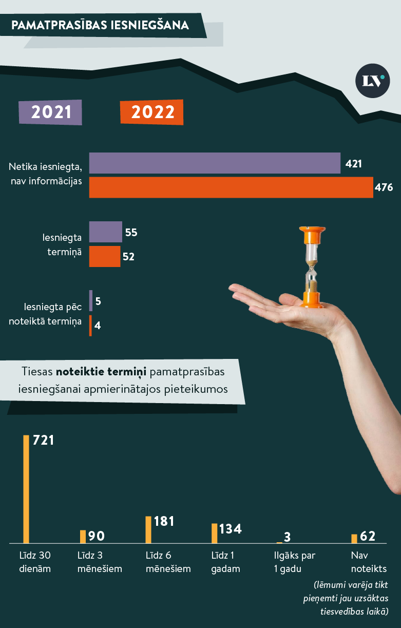 - Tiesām ir grūtības ievērot likumā noteikto termiņu, ja pieteikums saņemts pirmssvētku dienā vai piektdienā. Šādos gadījumos tiesas bija pieņēmušas lēmumus nākamajā darba dienā, nevis nākamajā dienā.