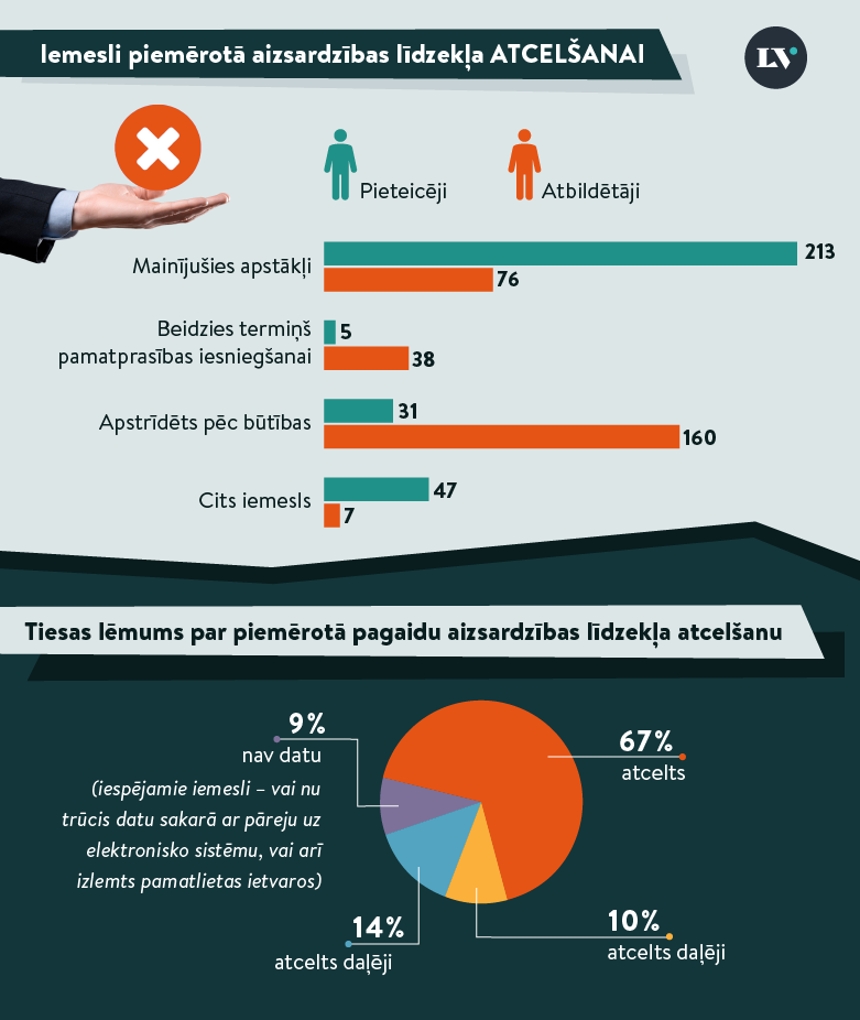- 67% gadījumu tiesa apmierinājusi pieteicēja vai atbildētā lūgumu par piemērotā pagaidu aizsardzības līdzekļa atcelšanu.