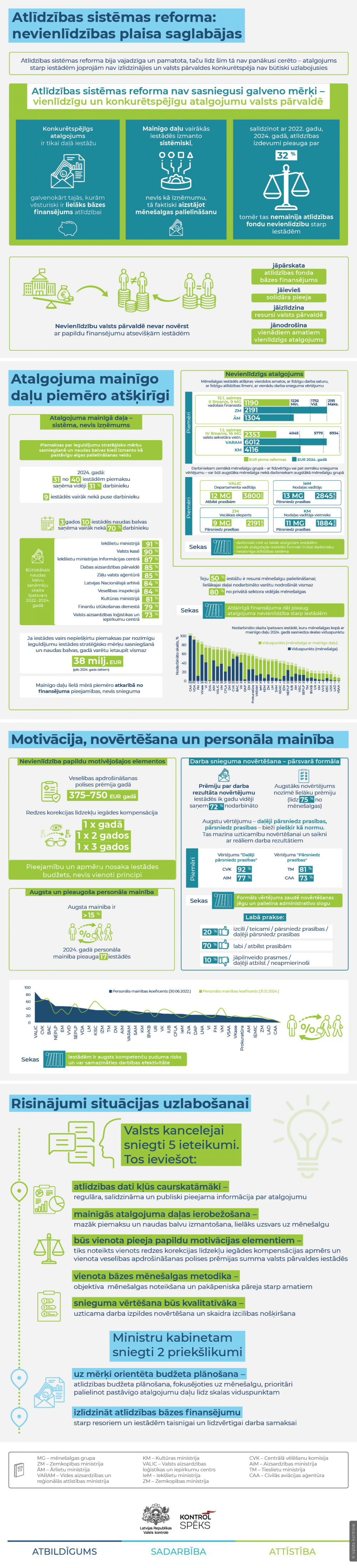 Valsts kontrole uzsver, ka bez politiska lēmuma par atlīdzības fondu izlīdzināšanu starp iestādēm reformas mērķi netiks sasniegti un esošās atšķirības valsts pārvaldē saglabāsies arī turpmāk.